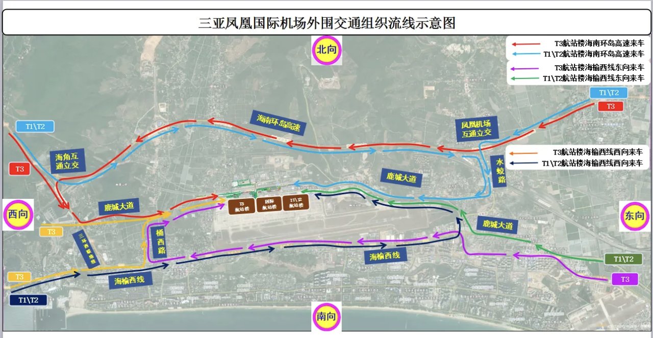 乐东、崖城往机场方向车辆,经G98高速公路行驶至凤凰机场互通驶下高速公路,至水蛟路、鹿城大道后往机场方向行驶抵达T1/T2航站楼;经G225国道、御海路、三环西联络线往机场方向的车辆,可从海榆西线往东行驶,至凤凰路、鹿城大道后往机场方向行驶抵达T1/T2航站楼。在G98高速公路海角互通下高速公路的车辆,无法从鹿城大道西段途经T3航站楼区域往T1/T2航站楼通行。